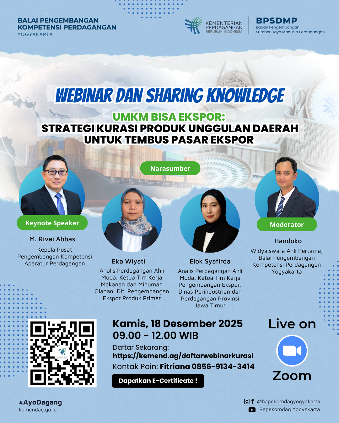 Selain itu, dalam rangka memberikan wawasan praktis secara lebih luas mengenai proses kurasi produk yang efektif kepada para aparatur bidang perdagangan sehingga diharapkan dapat membekali pelaku usaha daerah agar mampu bersaing dan berkelanjutan di pasar global yang lebih kompetitif, maka Bapekomdag Yogyakarta akan menyelenggarakan kegiatan Kegiatan Webinar dan Sharing Knowledge